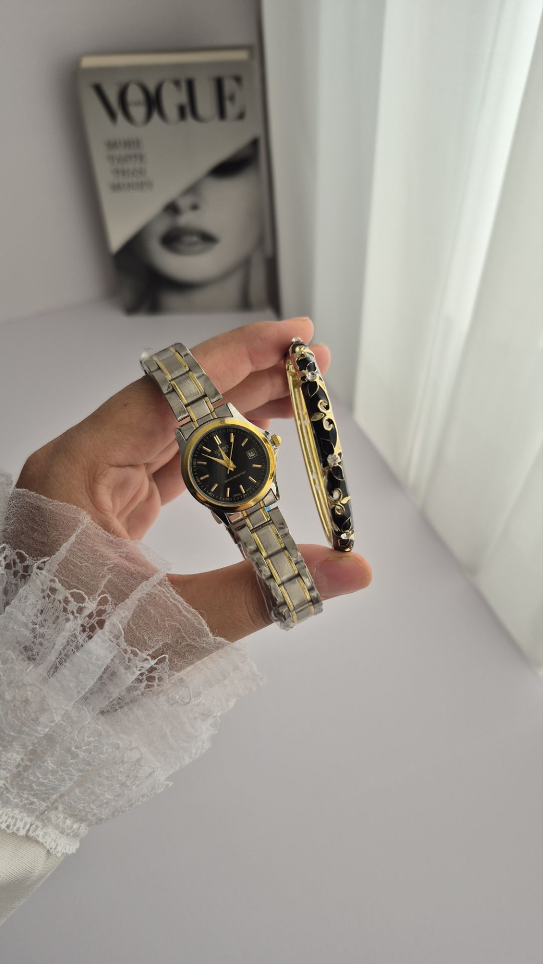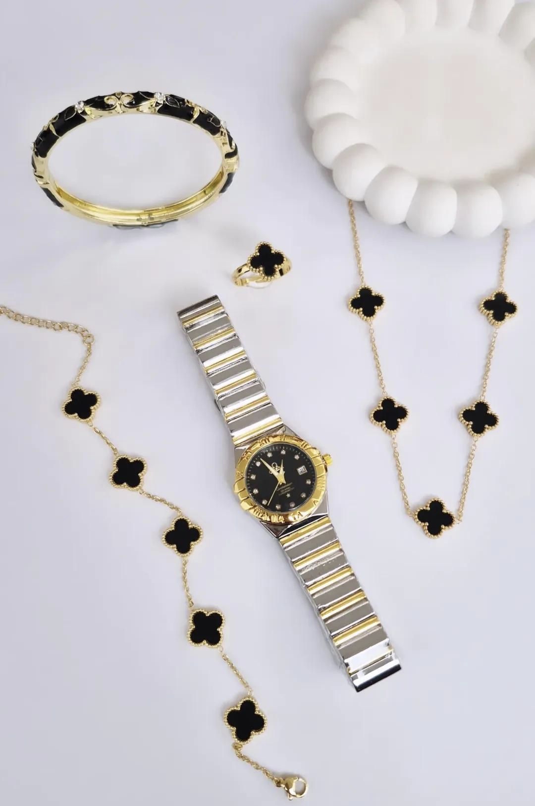 ساعت امگا زنانه صفحه مشکی با بند دو رنگ